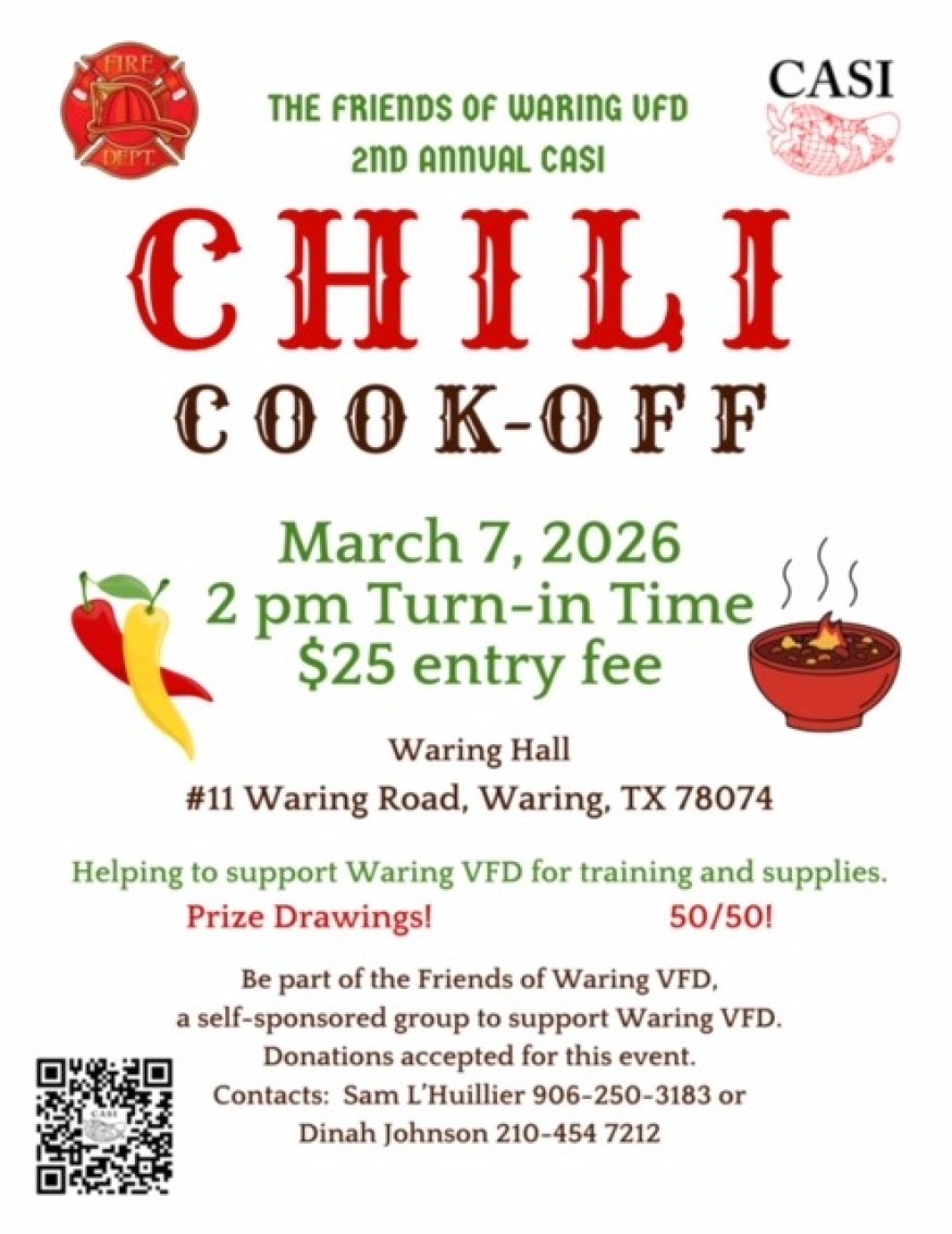 Get ready to turn up the heat at the 2nd Annual Friends of Waring VFD Chili Cook-Off! Join the community on Saturday, March 7, 2026, at Waring Hall for an afternoon of bold flavors, friendly competition, and local fun—all in support of the Waring Volunteer Fire Department.