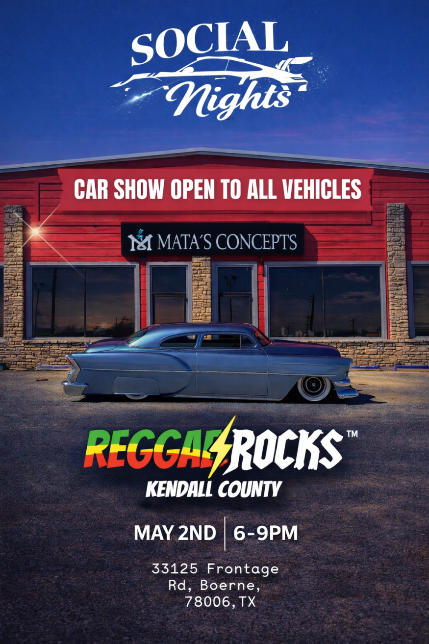 Join Reggae Rocks Kendall County for Social Nights on May 2nd from 6–9 PM at Mata’s Concepts in Boerne. Bring your ride and enjoy an evening car show open to all vehicles, great music, and community vibes. Whether you’re showing off your classic, custom, or daily driver, everyone is welcome at 33125 Frontage Rd for a night of cars, culture, and good energy.