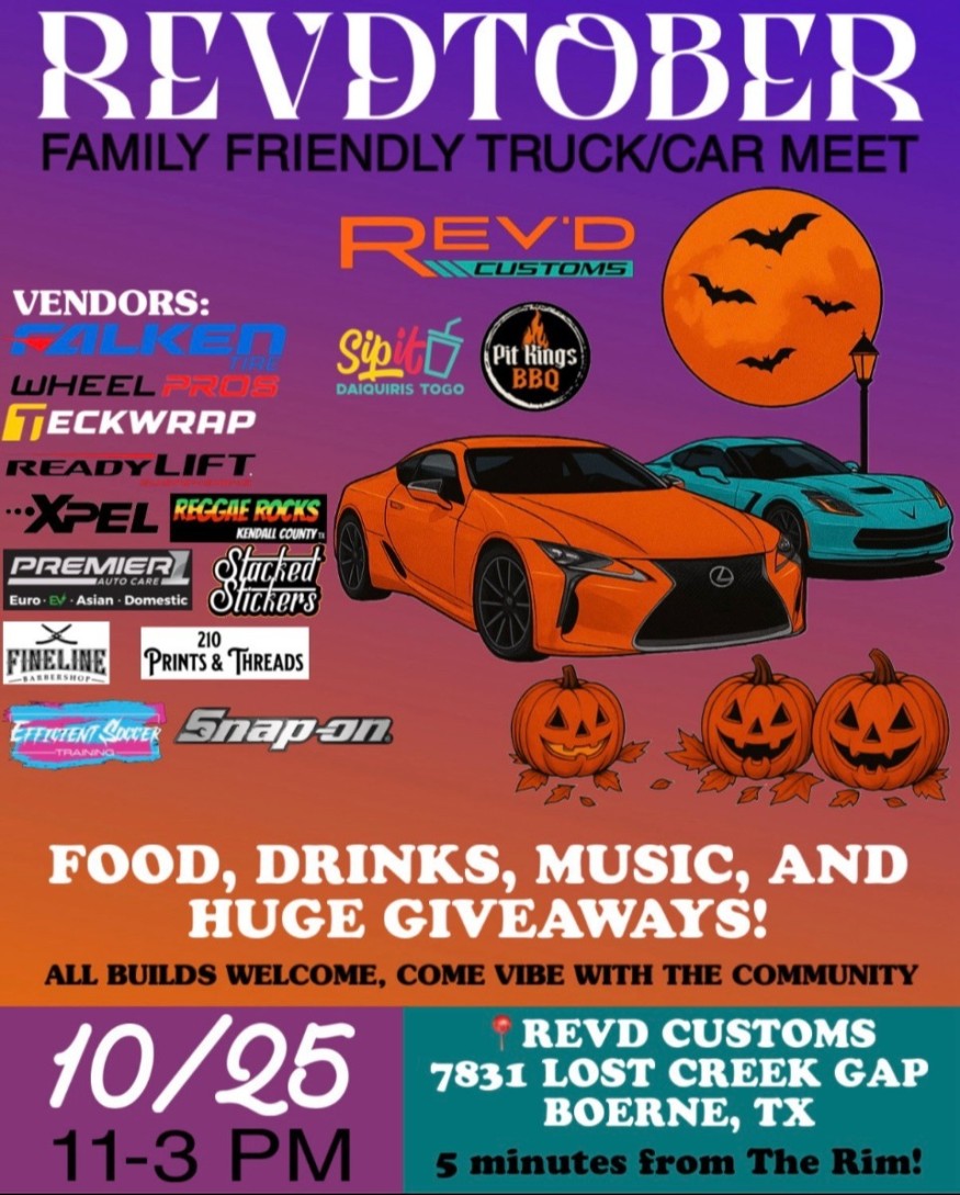 Get ready for Rev’dtober, a family-friendly truck and car meet happening Saturday, October 25th from 11 a.m. to 3 p.m. at Rev’d Customs, located at 7831 Lost Creek Gap in Boerne — just five minutes from The Rim! Come check out the Hill Country’s hottest rides, enjoy food, drinks, music, and huge giveaways, and connect with local vendors like Pit Kings BBQ, Sip It Daiquiris To Go, Reggae Rocks Kendall County, and more. All builds are welcome — cars, trucks, customs, and classics! Bring the family, grab a bite, and vibe with the community at Rev’dtober — where horsepower meets Hill Country fun!