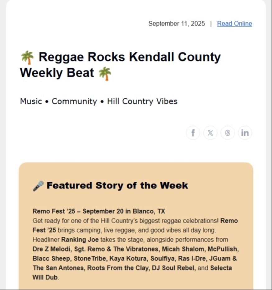 The Reggae Rocks weekly beat is here and in your email every week with local News, Sports, Events, Giveaways and so much more sign up here! ???? Reggae Rocks Kendall County Weekly Beat ????